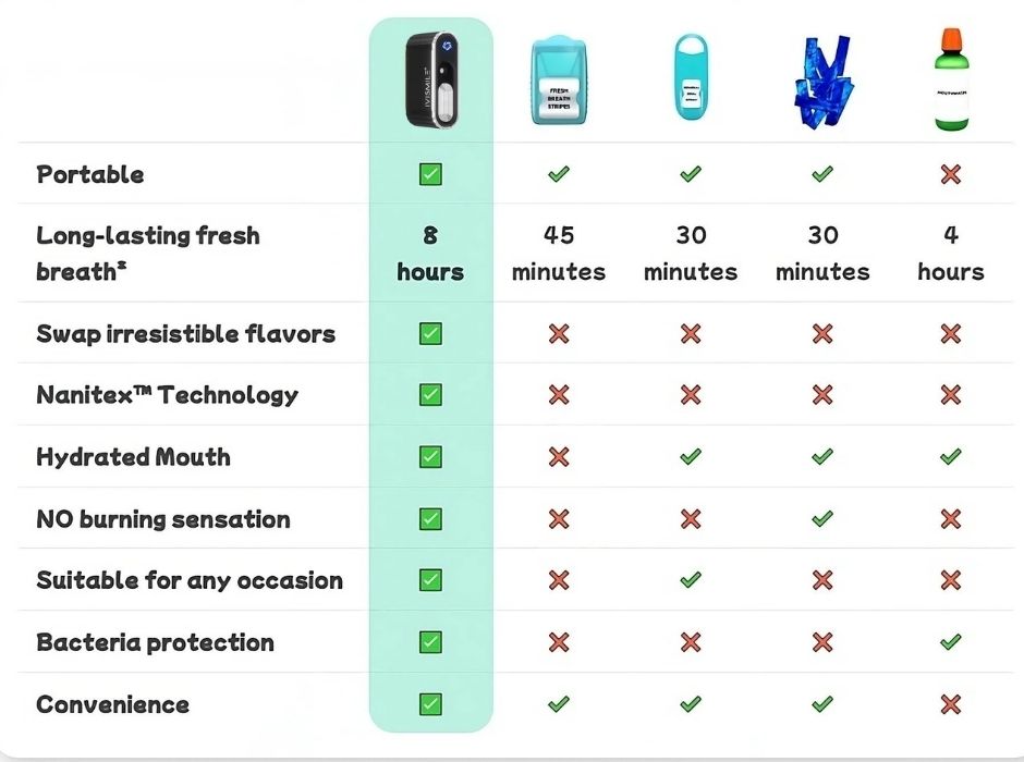Micro - atomization creates ultra-fine particles and electronically directs them deep into the mouth. This ensures 8 real hours of continuous freshness with only one spray.